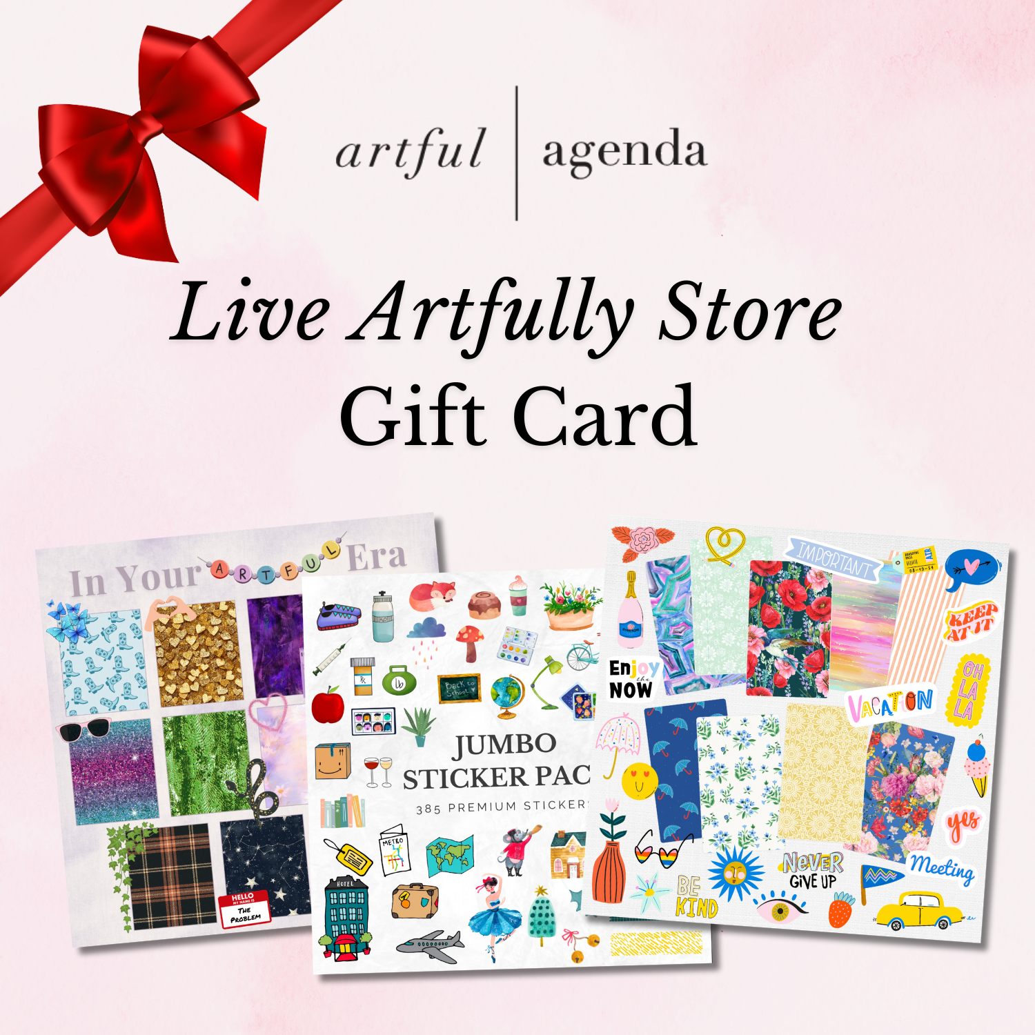 Write the gift code you receive via email in this printable gift certificate: https://artfulagenda.com/live-artfully-store-gift-card/
